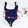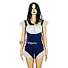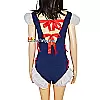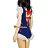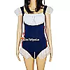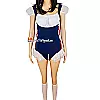 Trang phục nổi bật với tông màu xanh navy phối trắng trang nhã, kết hợp các chi tiết bèo nhún nhẹ nhàng và nơ đỏ làm điểm nhấn, vừa đáng yêu vừa khiêu khích. Phần tay phồng và viền chân váy xuyên thấu tạo cảm giác mong manh nhưng không kém phần gợi cảm. Các dải nơ buộc hai bên giúp điều chỉnh form dáng linh hoạt, phù hợp nhiều vóc dáng khác nhau.